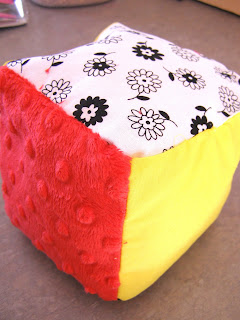 I chose to go with black, white, red and yellow because I think they are super fun together and can be boy or girl. I added a few fun things as well. On two if the sides I added a square of chip bag to make it nice and crinkly. I cleaned out the bag and cut out squares. After I ironed on the interfacing I sewed the bag onto 2 blocks. I just went down to two sides to hold it in place. Also it works much better if the bag is on top instead of on bottom while sewing.